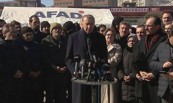 Erdoğan, merkez üssü Kahramanmaraş'ın Pazarcık ve Elbistan ilçeleri olan 7,7 ve 7,6 büyüklüğündeki depremlerin ardından AFAD tarafından Onikişubat Stadyumu'nda kurulan çadır kentte incelemelerde bulunduktan sonra basın mensuplarına açıklama yaptı.